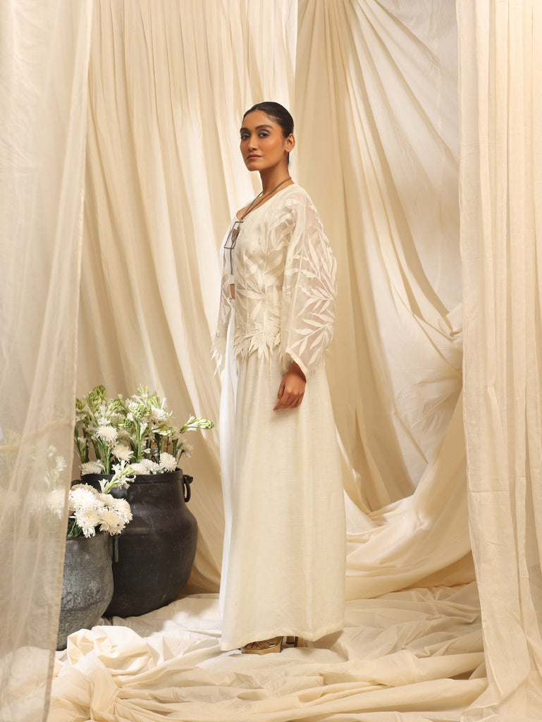 Featuring our ivory self on self bamboo leaves embroidered boxy jacket with innet and pleated pant.