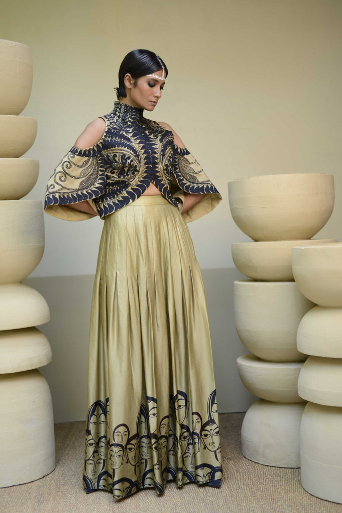 Embroidered cold shoulder bankura jacket with printed skirt.Heavy embroidered cold shoulder bankura cropped jacket with portrait pleated skirt.