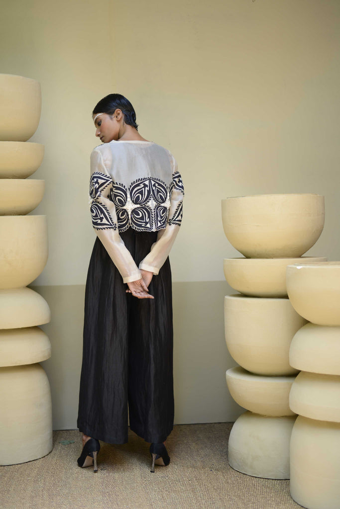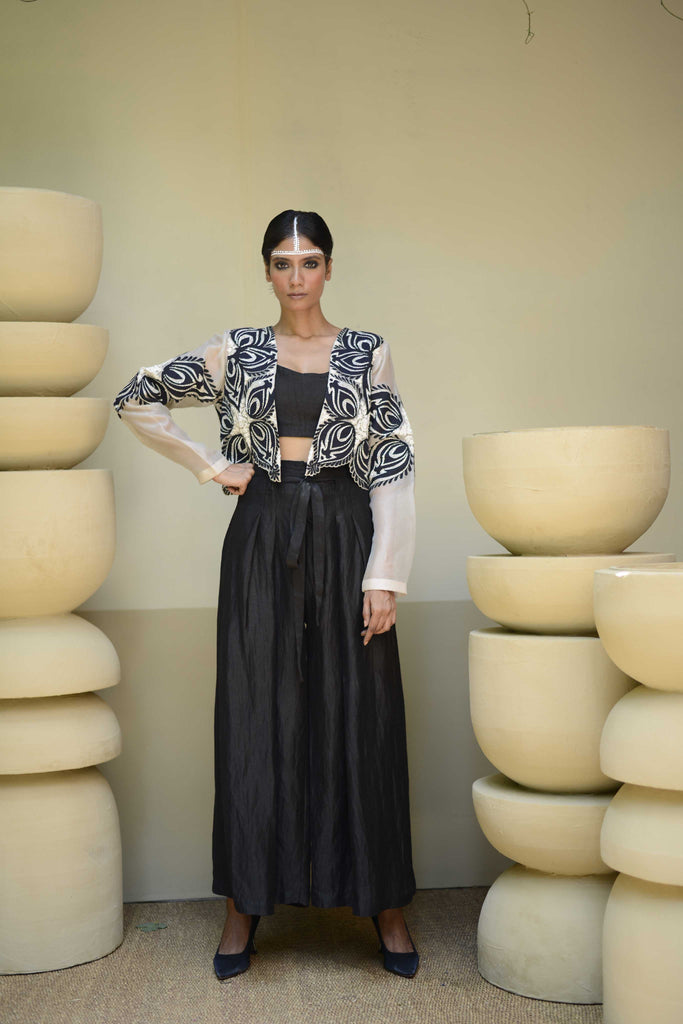 Embroidered cropped jacket with inner and pleated pants.The eye of the leaf embroidered cropped jacket with inner and culottes.