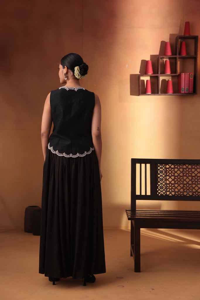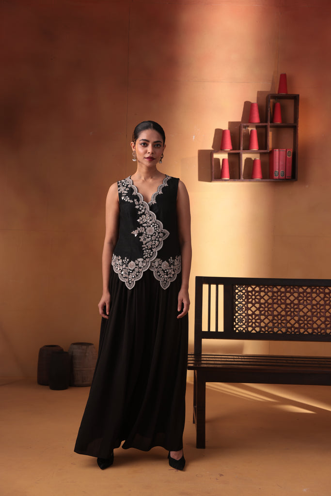 Featuring our black heavy embroidered waistcoat with pleated pant.